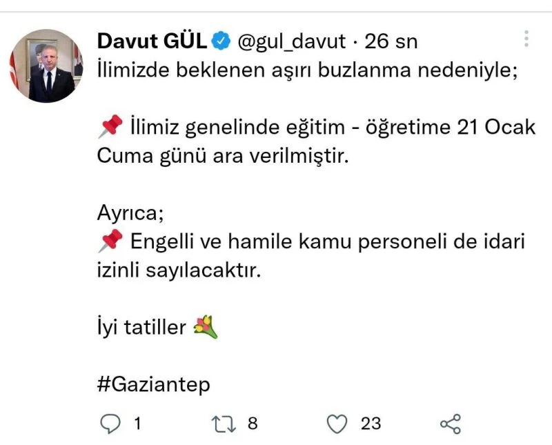Vali Gül, sosyal medya hesabından yaptığı açıklamada, "İlimizde beklenen aşırı buzlanma nedeniyle ilimiz genelinde eğitim - öğretime 21 Ocak Cuma günü ara verilmiştir. Ayrıca, engelli ve hamile kamu personeli de idari izinli sayılacaktır. İyi tatiller" ifadelerine yer verildi.