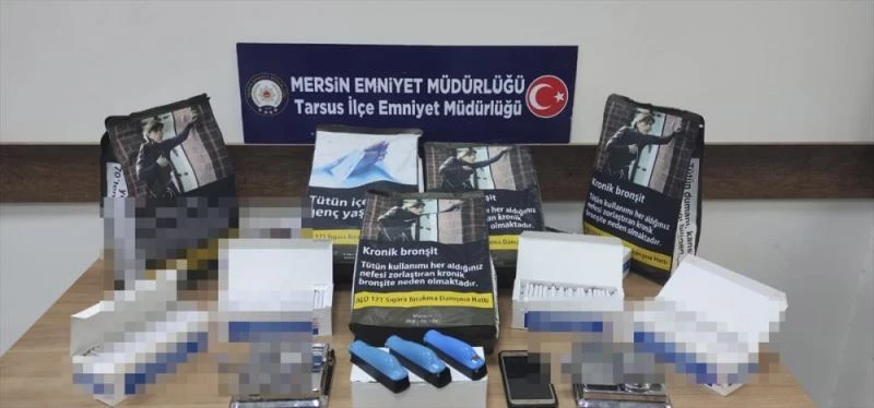 M.E.B'nin adresinde 5 kilogram tütün, 6 paket makaron (filtreli sigara kağıdı) ve tütün sarma makinesi bulundu.