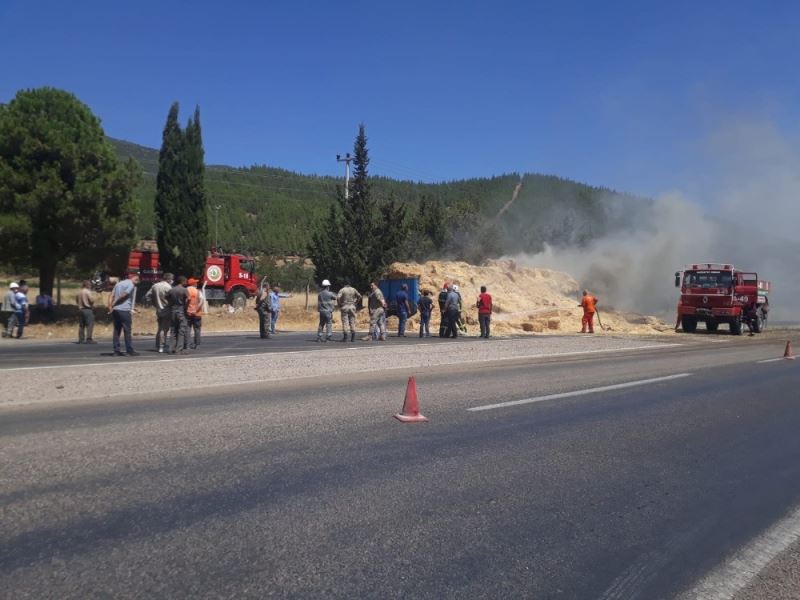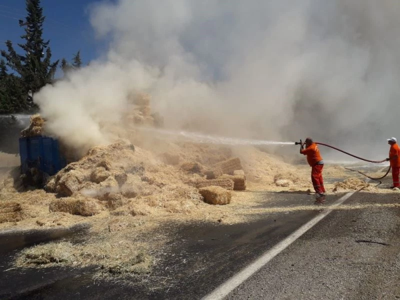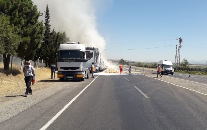 Çıkan yangında, tıra yüklenen samanlar büyük ölçüde yanarken, tırın dorsesi kullanılamaz hale geldi.