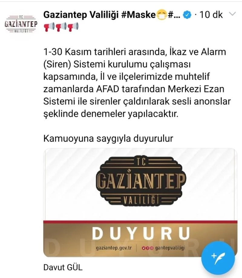 Gaziantep Valiliği’nden sosyal medyadan yapılan duyuruda siren sistemlerinin kurulum ve deneme çalışmalarının 30 Kasım’a kadar süreceği belirtilenek, "1-30 Kasım tarihleri arasında ikaz ve alarm (siren) sistemlerinin kurulum çalışmaları kapsamında, il ve ilçelerimizde muhtelif zamanlarda, AFAD tarafından merkezi ezan sistemi ile alarmlar çaldırılarak, sesli anonslar şeklinde denemeler yapılacaktır" ifadeleri kullandı.