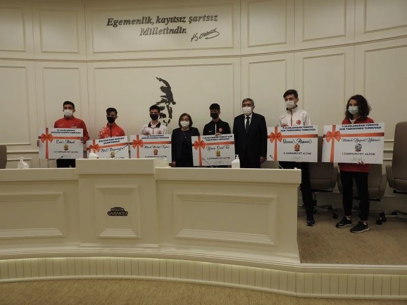 Derece alan sporculara önerilerde bulunan ve sporculara değer verdiğini söyleyen Gaziantep Büyükşehir Belediye Başkanı Fatma Şahin, "Şu anda toplam havuz sayımız 14 ve toplam kapalı spor salonumuz 80 tane oldu. Olağanüstü bir şey bu. Olağanüstü bir dönem, olağanüstü bir çalışma oldu. Bu başarıların hiçbiri tesadüf değil. 4 cumhuriyet altını kazanmış Eren kardeşimiz. Bir dinleyin hayatını tırnaklayarak mücadele ederek gelmiştir. Burada bulunan herkesin hayatında bir mücadelesi var. O yüzden sizden istirhamım asla vazgeçmeyin. En küçük bir güçlükte vazgeçtim demeyin. Size verdiğimiz bu küçük hediyelerde bir şey değil. Bunun anlamı siz bizim için kıymetlisiniz. Biz vallahi de billahi de sizleri çok seviyoruz. Emeği geçen herkese teşekkür ediyorum" diye konuştu.
