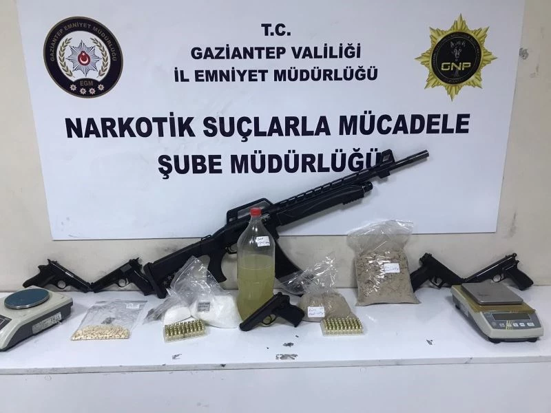 Gaziantep Emniyet Müdürlüğüne bağlı Narkotik Suçlarla Mücadele Şube Müdürlüğü ekiplerince 5 ayrı adrese operasyon yapıldı. Yapılan operasyonda 10 şüpheli gözaltına alınarak haklarında yasal işlem başlatıldı. Ayrıca şüpheli şahısların ikametlerinde yapılan aramalarda, 2 kilo 750 gram metamfetamin, 2 kilo eroin, 450 adet captagon hap, 5 adet tabanca, 1 adet av tüfeği, 3 adet hassas terazi ele geçirildi.