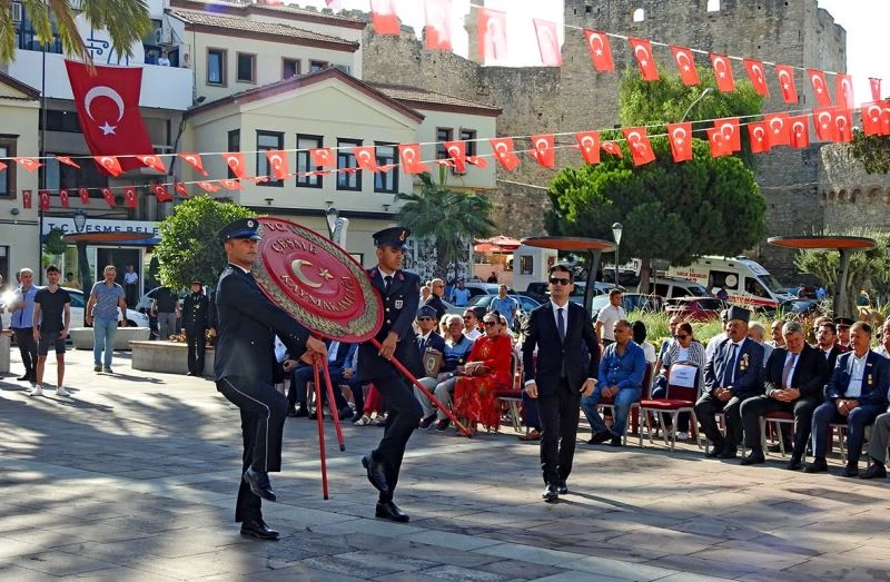 Cumhuriyet Meydanı’nda gerçekleştirilen resmi törene, Çeşme Kaymakamı Mehmet Maraşlı, Çeşme Belediye Başkanı Ekrem Oran, Çeşme Cumhuriyet Başsavcısı Burak Kocaoğlu, resmi kurum amirleri, siyasi parti temsilcileri, sivil toplum kuruluşları ve meslek odaları temsilcileri, belediye meclis üyeleri, gaziler ve vatandaşlar katıldı. Çeşme Kaymakamlığı, Çeşme Belediye Başkanlığı, TBMM’de grubu bulunan siyasi partiler, sivil toplum kuruluşları ve meslek kuruluşları tarafından Atatürk büstüne çelenk sunulmasının ardından saygı duruşunda bulunularak İstiklal Marşı eşliğinde göndere bayrak çekildi.