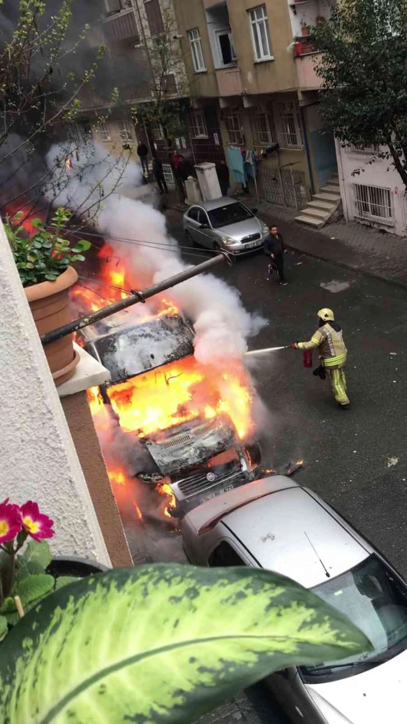 Gaziosmanpaşa’da park halindeki servis minibüsü alev alev yandı