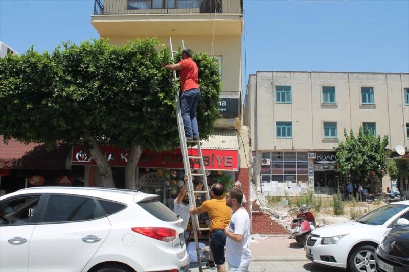 Atatürk Caddesi'nde esnaf, binlerce bal arisinin bir agacin dalinda biriktigini fark etti.