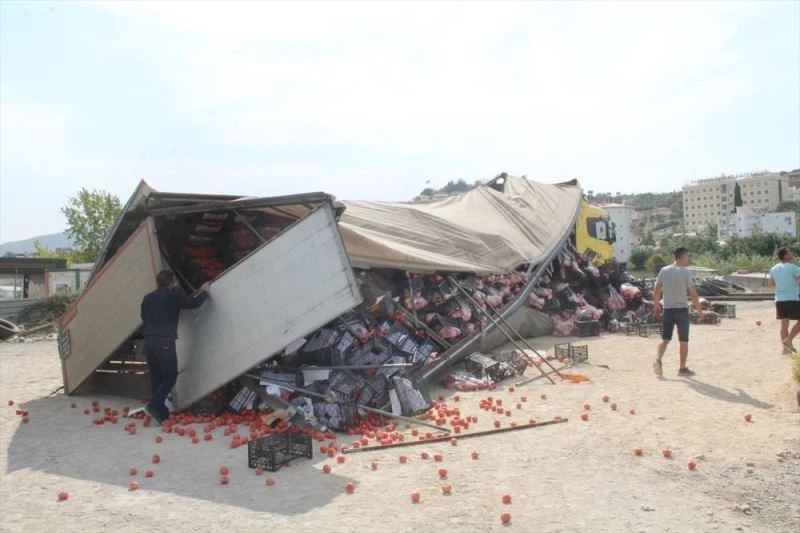 Olayda yaralanan olmazken, aracin kasasindaki 20 ton nar ve 5 ton domates döküldü.