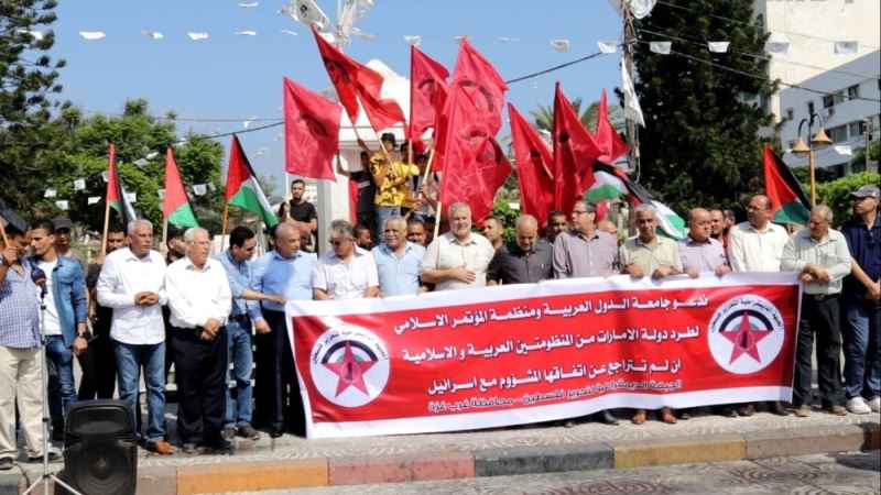 Filistin’de Birleşik Arap Emirlikleri (BAE) ile İsrail arasındaki ilişkilerin tamamen normalleştirilmesi kararına Filistinli siyasetçiler ve vatandaşlar tepki göstermeye devam ediyor. Gazze’de bir araya gelen Filistinli siyasetçiler BAE’yi protesto ederek "İsrail ile normalleşme bir suç", "Normalleştirmeye hayır" yazılı pankartlar açtı.
