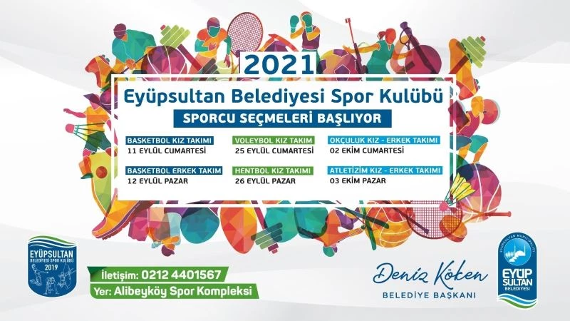 Eyüpsultan Belediye Başkanı Deniz Köken tarafından kurulan Eyüpsultan Belediyesi Spor Kulübü’nün seçmeleri başlıyor. Eyüpsultan’da geleceğin genç ve yetenekli sporcularını yetiştirecek olan kulüp bünyesinde karate, atletizm, okçuluk, yüzme, basketbol, tenis, hentbol branşlarında ilçe genelinde seçmeler yapılacak.