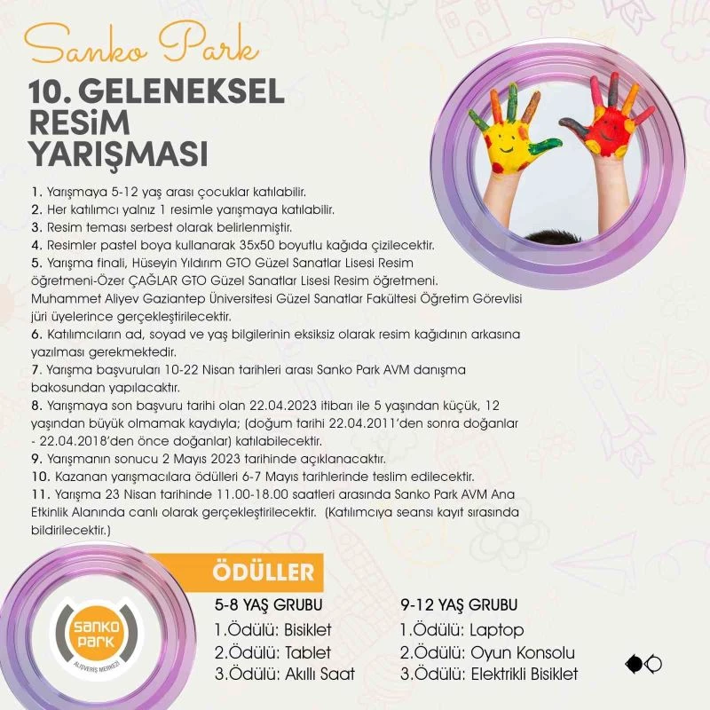 Gaziantep’in yaşam alanı Sanko Park Alışveriş Merkezi, 23 Nisan Ulusal Egemenlik ve Çocuk Bayramı’na özel ödüllü resim yarışması düzenliyor.