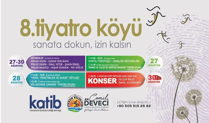 Birçok atölyenin yanı sıra halka açık tiyatro oyunları ve festival yürüyüşü ile tiyatronun kalbi Atakum’da atacak. Karadeniz Bölgesi’nde üretim yapan tüm tiyatro ekiplerini bir araya getirmek, ortak bir çatı altında toplamak amacıyla 2010 yılında Samsun’da kurulan Karadeniz Tiyatrolar Birliği (KATİB) 8. Tiyatro Köyü Buluşması’nı 7 ilden 19 farklı tiyatro grubunun katılımıyla 27-30 Ağustos tarihleri arasında Atakum Belediyesi’nin katkılarıyla gerçekleştirecek.