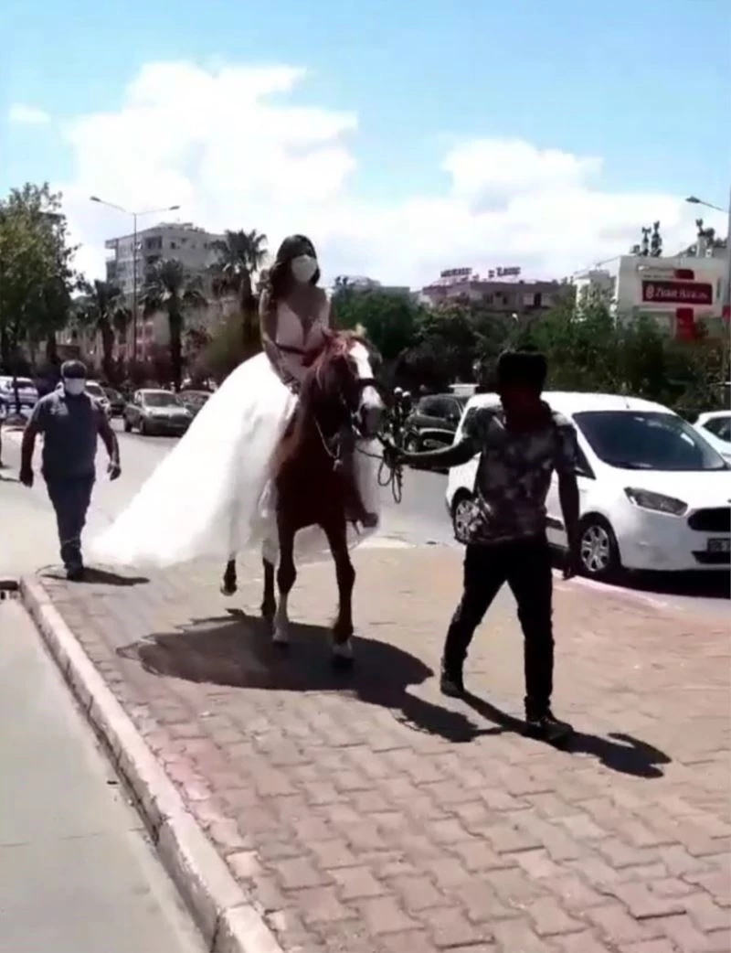 Antalya’da maskelerini takarak kendileri için hazırlanan araçlı konvoy yerine ata binen gelin ve damat, görenleri şaşırttı. Çift, kentin en işlek caddesinde araç konvoyu eşliğinde atlarıyla ilerledi.