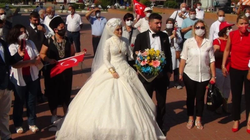 Bursa’nın İnegöl ilçesinde 30 Ağustos Zafer Bayramı’nın 98. yıl dönümü nedeniyle İnegöl Atatürk Düşünce Derneği bir program düzenledi. Program esnasında yoldan geçen gelin ve damat, ellerindeki çiçeği Atatürk Anıtı’na bırakınca alkış yağmuruna tutuldu.