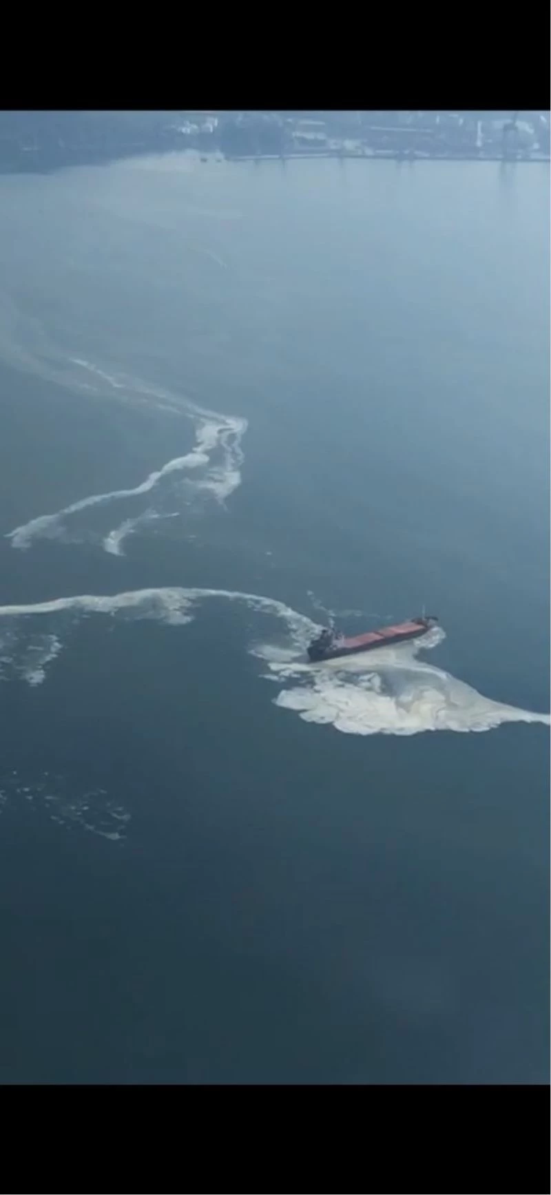 Bursa Gemlik Körfezi açıklarındaki bir geminin çevresindeki beyaz tabaka, yetkilileri harekete geçirdi. Geminin çevresindeki beyaz örtü, havadan görüntülendi.