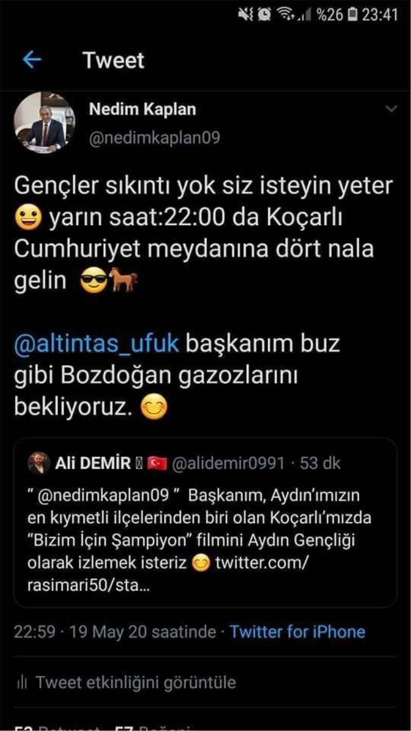İftar sonrasında AK Parti Aydın İl Gençlik Kolları Başkanı Ali Demir’in Twitter üzerinden Koçarlı Belediye Başkanı Nedim Kaplan’ı etiketleyerek “Başkanım Aydınımızın en kıymetli ilçelerinden biri olan Koçarlımızda ’Bizim İçin Şampiyon’ filmini Aydın gençliği olarak izlemek isteriz” diyerek bulunduğu çağrıya Belediye Başkanı Nedim Kaplan’dan cevap gecikmedi. Başkan Kaplan yine Twitter üzerinden verdiği cevapta “Gençler sıkıntı yok siz isteyin yeter. Yarın saat 22:00 da Koçarlı Cumhuriyet Meydanı’na dört nala gelin” diyerek Aydınlı gençlerin taleplerini geri çevirmedi. Kaplan ayrıca yaptığı paylaşımla Bozdoğan Belediye Başkanı Ufuk Altıntaşa’da çağrıda bulunarak “Başkanım buz gibi Bozdoğan gazozlarını bekliyoruz” dedi. Bozdoğan Belediye Başkanı Altıntaştan gazoz sözünü de alan Başkan Kaplan 20 Mayıs akşamı saat 22:00 da Sosyal mesafe kurallarına uyma şartıyla gençleri araçları ile birlikte Koçarlı Cumhuriyet Meydanına davet etti.