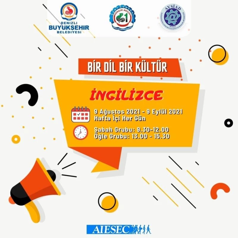 Denizli Büyükşehir Belediyesi Kent Konseyi Gençlik Meclisi, Genç AYSİAD(Avrasya Yönetici Sanayici ve İş Adamları Derneği) ve uluslararası gençlik organizasyonu AIESEC Denizli Şubesi iş birliğinde Küresel Gönüllük Projelerinden biri olan ’Bir Dil Bir Kültür’ projesini hayata geçiriyor. İngilizce üzerine olan Bir Dil Bir Kültür projesi 9 Ağustos - 9 Eylül tarihleri arasında hafta içi her gün 2 grup olarak gerçekleşecek. Yaşları 18-30 arasında değişen 7 farklı ülke ve 9 kişiden oluşan katılımcıların 5 Ağustos - 15 Eylül tarihlerinde Denizli’ye gelerek projeye katılım sağlayacağı ifade edildi. 6 hafta sürecek olan proje de kültürel kaynaşmanın sağlanması ve dil öğrenimine hız kesmeden devam edilecek.