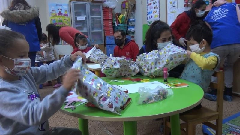 Anasınıfı öğrencileri kendileri için hazırlanan paketleri açtıklarında karşılaştıkları oyuncaklarla büyük mutluluk yaşarken diğer sınıflardaki öğrencilerde kendilerine hediye edilen ve sınıflarını süsleyen eğitim materyalleri için Gençlik Merkezi görevlilerine teşekkür ettiler.