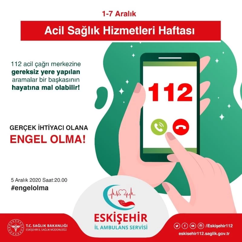 Eskişehir’de 1-7 Aralık Acil Sağlık Hizmetleri Haftası kapsamında 112 Acil Sağlık Hizmetleri hattına gelen gereksiz çağrıların önüne geçilmesi için başlatılan ‘Engelolma’ hashtag ile duyarlılığın arttırılması sağlanacak.