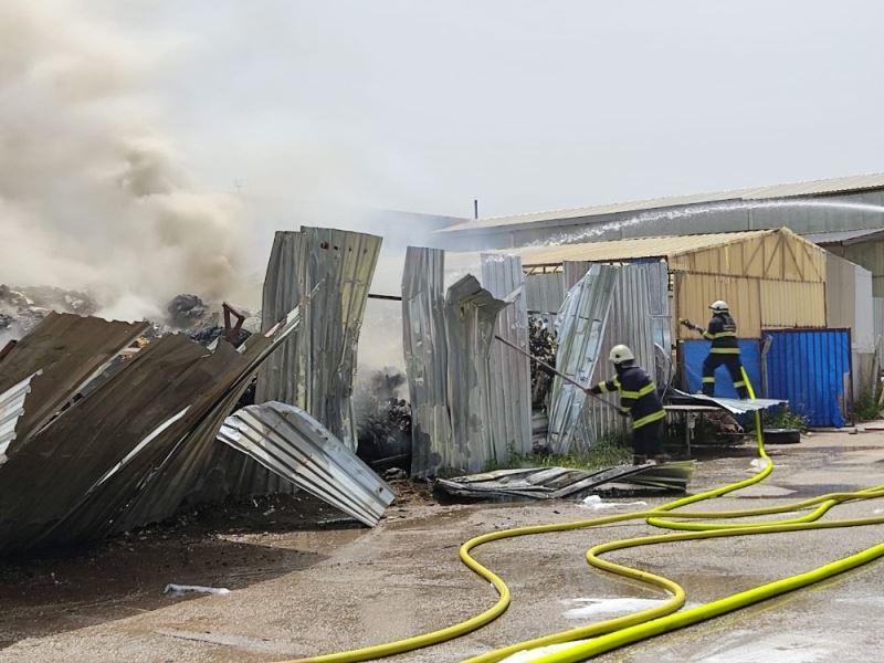 Geri dönüşüm deposunda çıkan yangında soğutma çalışmaları devam ediyor.
