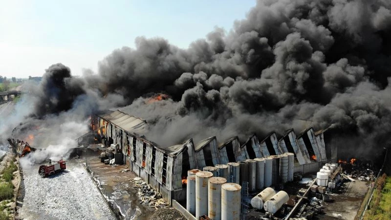 Siyah dumanların gökyüzünü kapladığı yangın drone ile havadan görüntülendi. Çevre il ve ilçelerden gelen itfaiye ekipleriyle müdahale edilen yangında patlama riskine karşı jandarma ekipleri tarafından güvenlik önlemleri alındı.