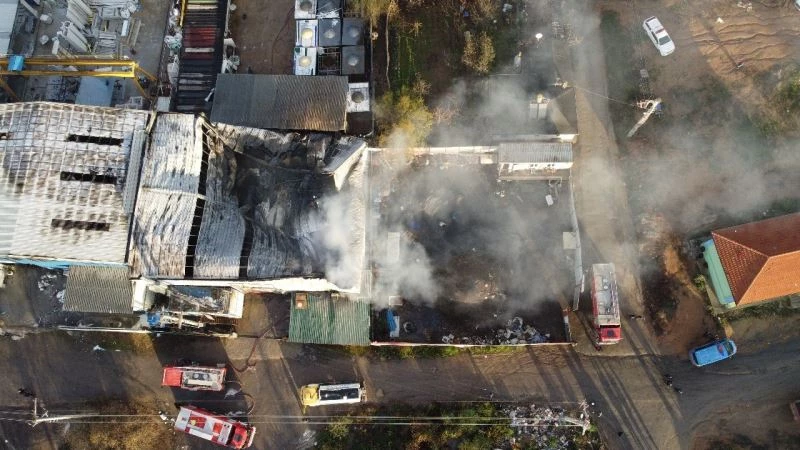 Yanan geri dönüşüm fabrikası havadan da görüntülendi.