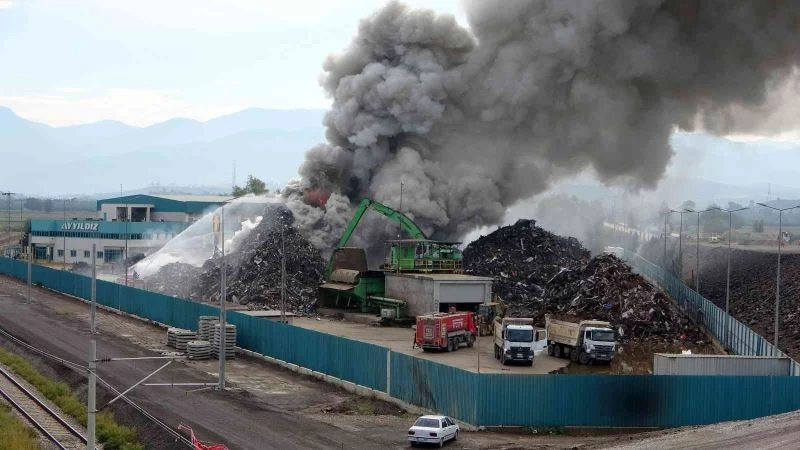 Osmaniye’nin Toprakkale ilçesinde hurda geri dönüşüm tesisinde çıkan yangına ekiplerin müdahalesi devam ediyor.