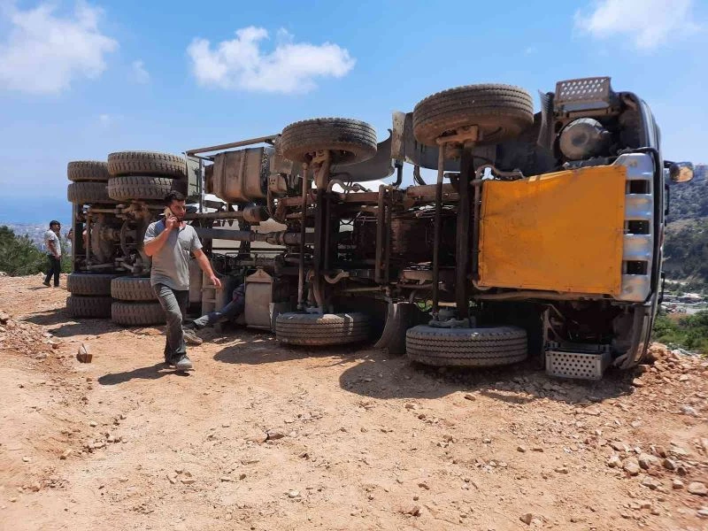 Antalya’nın Alanya ilçesinde inşaat alanına yanaşmak için geri manevra yapan beton mikseri devrildi.
