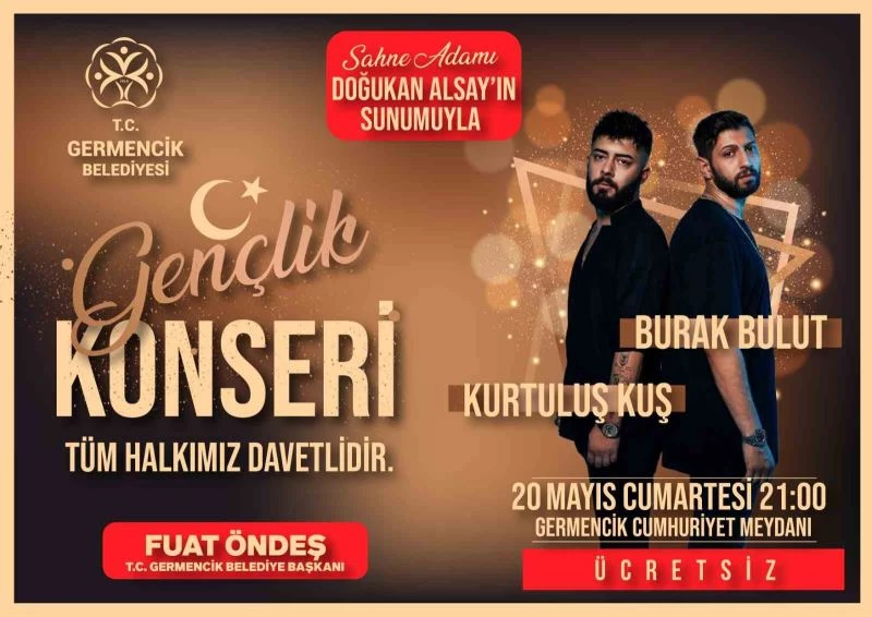 Milli Mücadele’nin ve Kurtuluş Savaşı’nın başlangıcı olan 19 Mayıs 1919’un 104’üncü yıl dönümü, Germencik’te konser ile kutlanacak. Germencik Belediye Başkanı Fuat Öndeş Aydınlıları, ünlü sanatçılar Kurtuluş Kuş ve Burak Bulut’un Cumartesi günü sahne alacağı konsere davet etti.