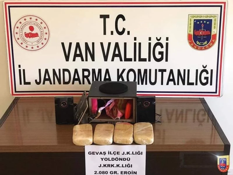 Edinilen bilgiye göre, Gevaş İlçe Jandarma Komutanlı ekipleri tarafından Van-Bitlis karayolu üzerinde bulunan Balaban Jandarma Asayiş ve Yol Kontrol Nokatası’nda şehirlerarası yolcu otobüsünde arama yapıldı. Yapılan aramda yolculardan birinin çantasında bulunan müzik kutusu içerisinde 2 kilo 80 gram eroin ele geçirilirken, olayla ilgili gözaltına alınan 1 şahıs tutuklandı.