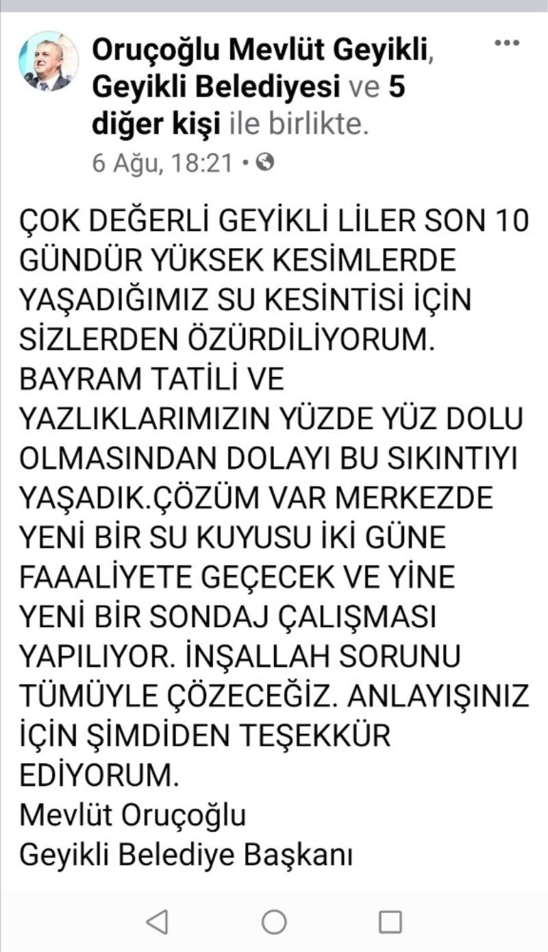 Sıkıntının aşırı yoğunluktan kaynaklandığını söyleyen Belediye Başkanı Mevlüt Oruçoğlu, sosyal medya hesabından yaptığı paylaşımda vatandaşlardan özür diledi. Bu meseleye çare bulmak için hemen harekete geçtiklerini kaydeden Oruçoğlu, yeni kuyular için sondaj çalışmalarına başladıklarını belirtti.