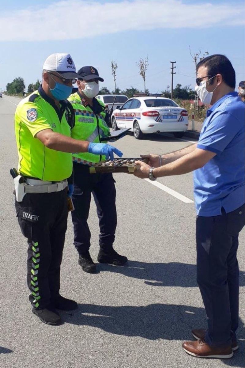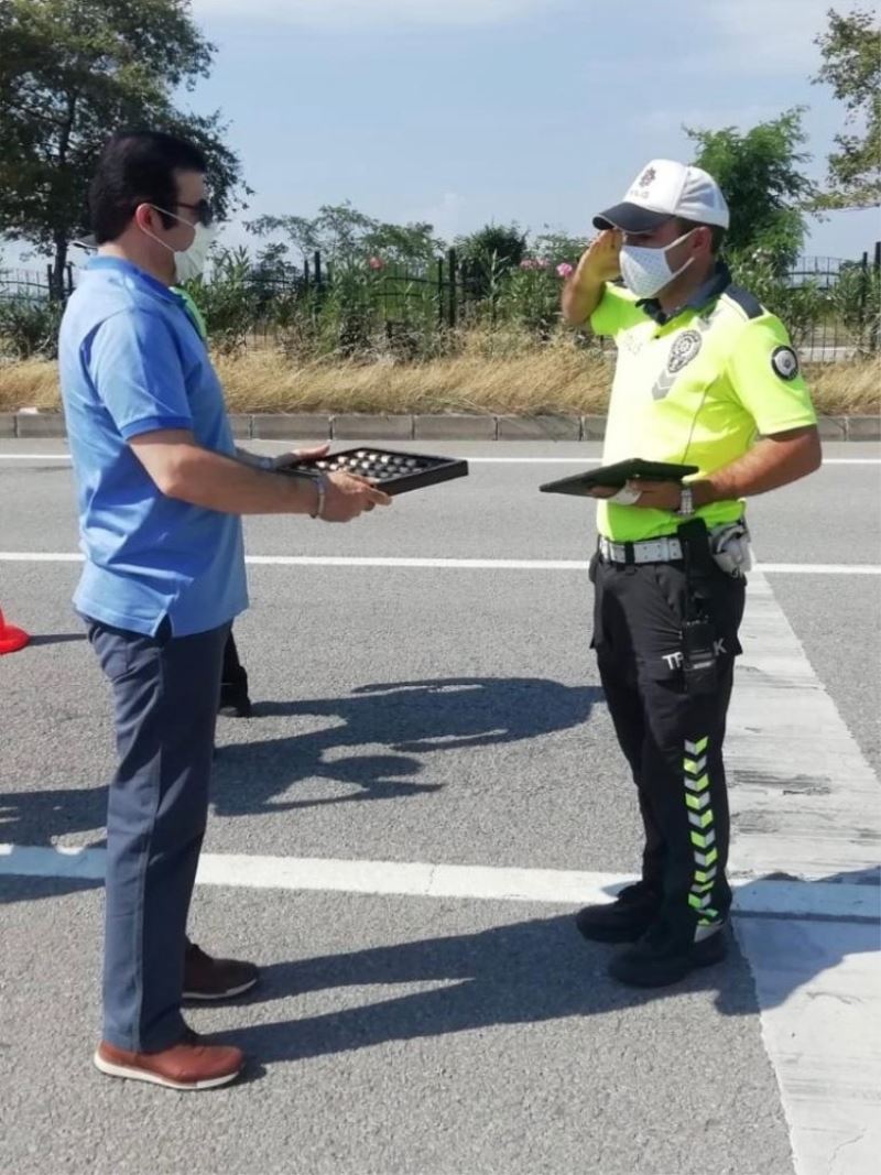 Giresun Vali Yardımcısı Hasan Tanrıseven, Ordu-Giresun il sınırında, Giresun’a seyahat eden yolcuların bayramlarını kutlayarak şeker ikramında bulundu.