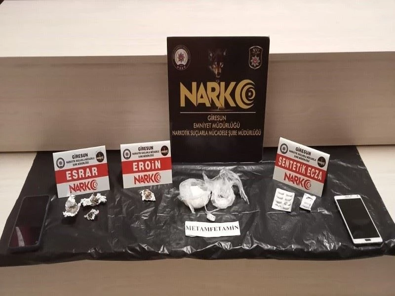 Giresun Cumhuriyet Başsavcılığı koordinesinde yapılan çalışma sonucunda G.D., H.K. ve S.K. isimli şüpheli şahıslardan 43 adet perge hap, 0,8 gram esrar maddesi, 2 adet cam aparatı (bong) ele geçirildi.