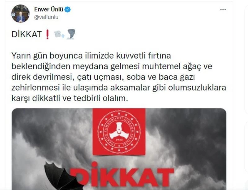 Giresun Valisi Enver Ünlü de, yapılan hava değerlendirmesine göre aşırı yağmur ve fırtınanın beklendiğini belirterek, sosyal medya hesabı üzerinden," Yarın gün boyunca ilimizde kuvvetli fırtına beklendiğinden meydana gelmesi muhtemel ağaç ve direk devrilmesi, çatı uçması, soba ve baca gazı zehirlenmesi ile ulaşımda aksamalar gibi olumsuzluklara karşı dikkatli ve tedbirli olalım” uyarısında bulundu.