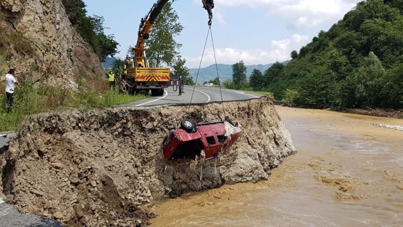 Giresun’da etkili olan sağanak yağışın hasara yol açtığı noktalardan biri de Yağlıdere ilçesi olurken, ilçeyi sahile bağlayan Yağlıdere-Espiye karayolunda kopmalar meydana geldi. Kopmanın olduğu noktada derede görülen araç paniğe neden oldu.