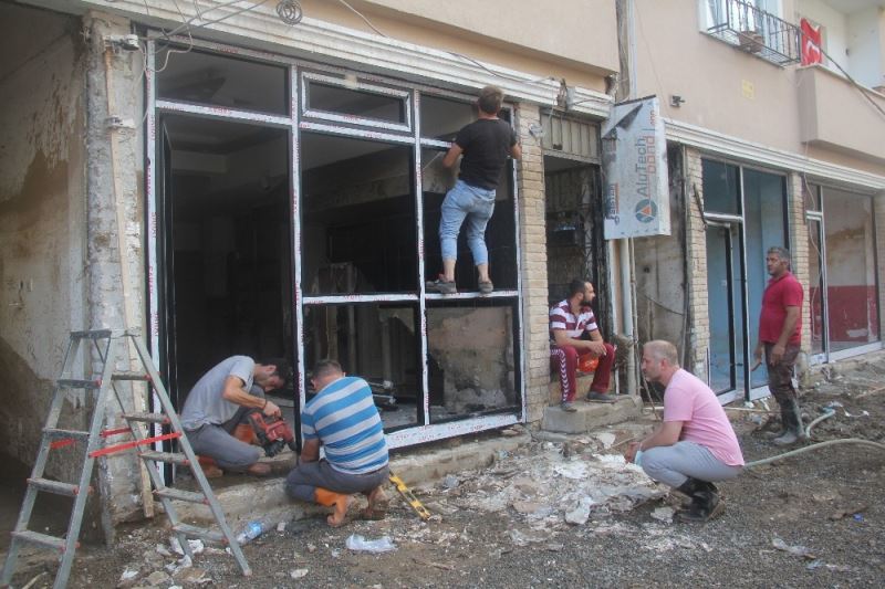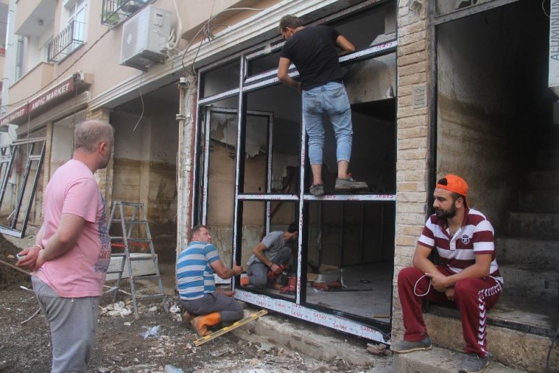 Belediye ve TOKİ organizasyonunda ilçe merkezinde selden zarar gören yaklaşık 200 esnafın iş yerleri onarılmaya başlandı. Adeta harabeye dönen dükkanın temizliğini yapıp çerçevelerini takan esnaftan birisi olan Nurullah Barıtçı, “Belediye ve TOKİ koordinasyonunda dükkanlarımız onarılıyor. Sağ olsun devletimiz her türlü desteği sağlıyor. Önce askerler ve gönüllüler tarafından dükkanlarımızı temizledik. Şimdi de yeniden dükkanımızı açabilmek için çalışıyoruz. Şuanda harabeye dönen dükkanımızın çerçevelerini taktık. Boya parke gibi çalışmaların ardından yeniden lokantamızı inşallah hizmete açacağız” ifadelerini kullandı.