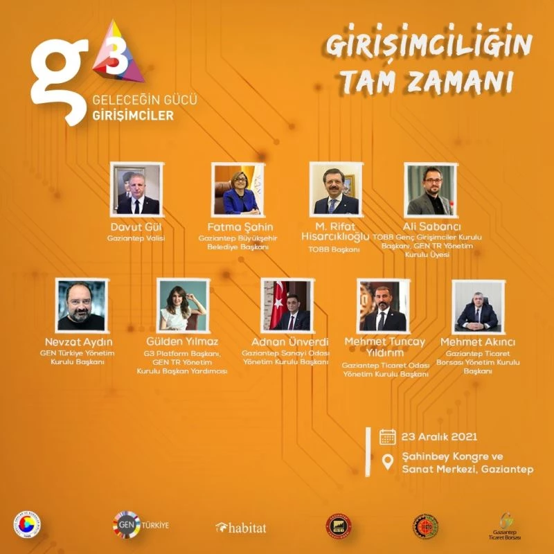 Gaziantep Valisi Davut Gül, Gaziantep Büyükşehir Belediye Başkanı Fatma Şahin, TOBB Başkanı Rifat Hisarcıklıoğlu, TOBB Genç Girişimciler Kurulu Başkanı ve GEN Türkiye Yönetim Kurulu Üyesi Ali Sabancı, GEN Türkiye Yönetim Kurulu Başkanı Nevzat Aydın ile G3 Platform Başkanı ve GEN Türkiye Y.K Başkan Yardımcısı Gülden Yılmaz’ın açılış konuşmalarını gerçekleştireceği Forum, 23 Aralık Perşembe günü Şahinbey Kongre ve Sanat Merkezinde düzenlenecek.
