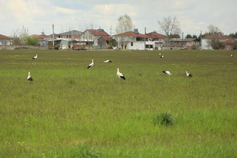 Sakarya’nın Erenler ilçesi yakınlarında göç yolundaki leylekler, yol kenarında bulunan sulak arsaya inerek mola verdi.