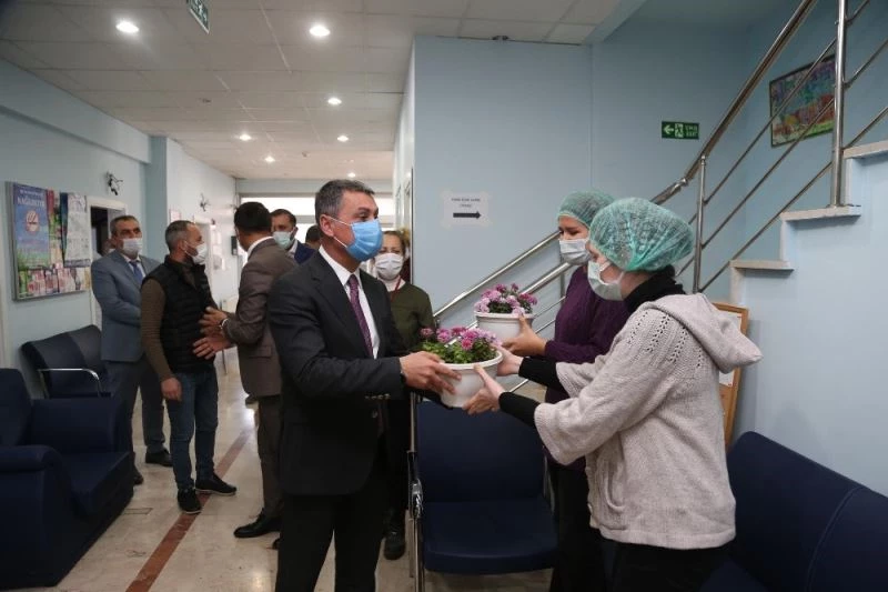 Sağlık çalışanlarına meyve ikram ettikten sonra, Gölbaşı Belediyesi serasında üretilen Kasımpatı çiçeğini de takdim eden Ramazan Şimşek, ayrıca fillasyon ekibinde çalışan diş hekimlerinin 22 Kasım Dünya Diş Hekimler Gününü ’de kutladı.