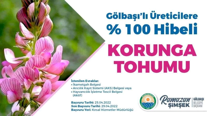 Gölbaşılı vatandaşların bal üretimini artırmak ve Türkiye’nin tarımsal ekonomisine katkıda bulunmalarını sağlamak amacıyla; çok yıllık, çiçeklenme dönemi uzun, bal kalitesini artıran, İç Anadolu iklimine uyumlu, kuraklığa ve özellikle soğuğa dayanıklı, kireçli, kuru ve kıraç topraklarda yetişebilen, büyükbaş ve küçükbaş hayvan beslemesinde yeşil ve kuru ot olarak değerlendirilen ve protein oranı hayvan beslemesi açısından yüksek olan, 1 kilo ekilen tohumdan en az 10 kilo tohum hasadı yapılabilen Korunga tohumunun dağıtımı istenilen belgeler karşılığında vatandaşla buluşacak.