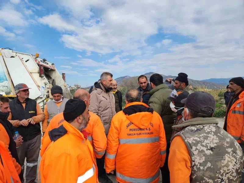 Gölcük Belediye Başkanı Ali Yıldırım Sezer, dezenfeksiyon işlemlerinin koordinasyonunu sağlamak için saha çalışmalarını denetlediği Hatay’da depremzedelerin taleplerini de dinledi.
