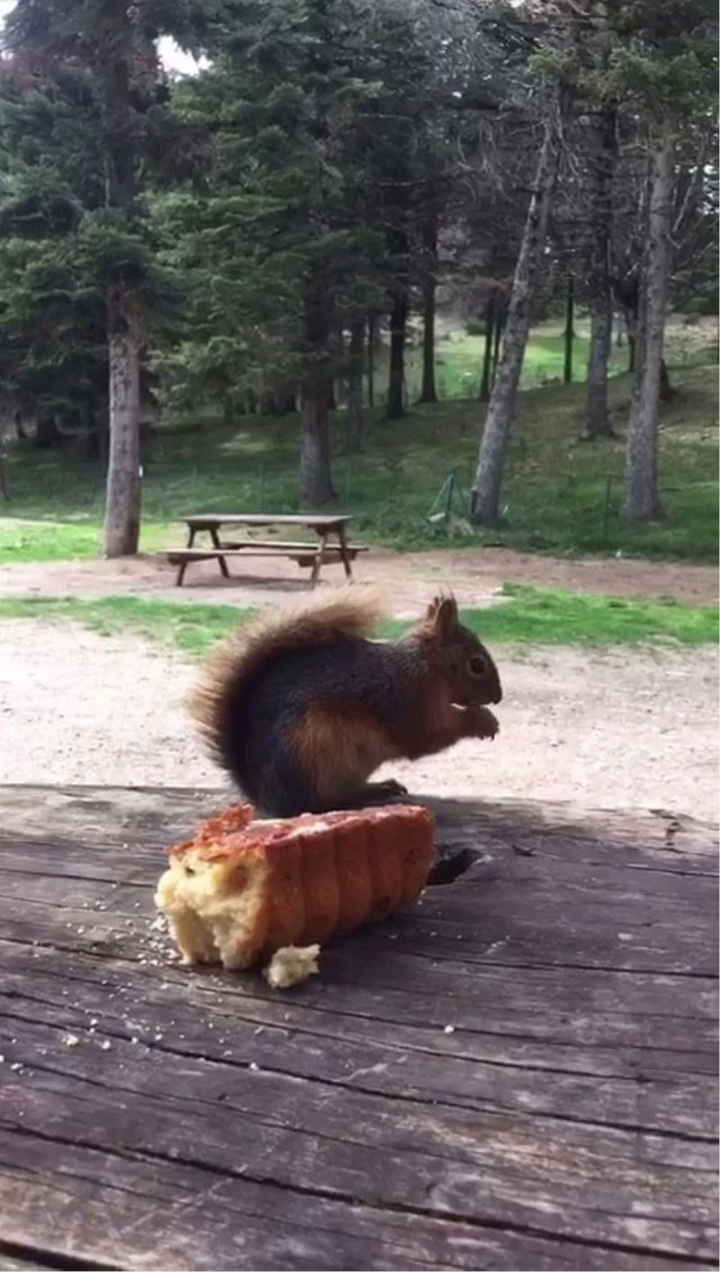 Bolu’nun gözde turizm merkezi Gölcük Tabiat Parkı’nda yaşayan ve piknik masalarındaki yiyeceklerle beslenen sincap tatilcilerin maskotu haline geldi.