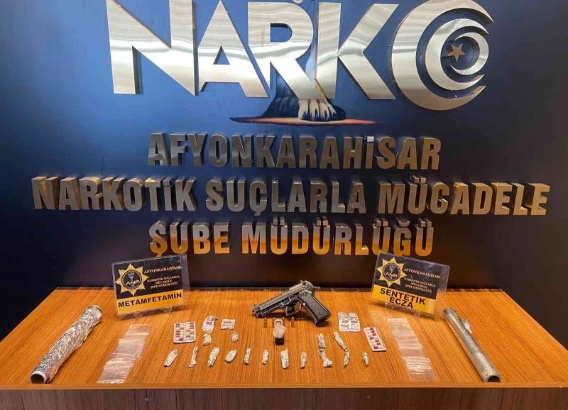 Afyonkarahisar İl Emniyet Müdürlüğü Narkotik Suçlarla Mücadele Şubesince Veysel Karani ve Hoca Ahmet Yesevi mahallelerinde sokak satıcılarına yönelik yapılan kontrollerde, sokak üzerinde şüphelenilen bir motorlu şahıs ve görüştüğü 3 şahıs durdurularak üst araması yaptı. Yapılan aramalarda; 17 fişek halinde satışa hazır toplam 19.72 gram metamfetamin maddesi, 22 adet sentetik ecza maddesi, uyuşturucu madde fişeklemesinde kullanılan çok sayıda kilitli poşet, 1 adet ruhsatsız tabanca ele geçirildi.