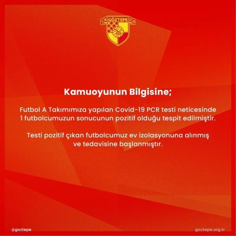 Spor Toto Süper Lig ekiplerinden Göztepe, futbol A Takımına yapılan PCR testi sonucunda 1 futbolcusunda pozitif vaka tespit edildiğini açıkladı. Sarı-kırmızılı kulüp, testi pozitif çıkan oyuncunun ev izolasyonuna alındığını ve tedavisine başlandığını açıkladı.
