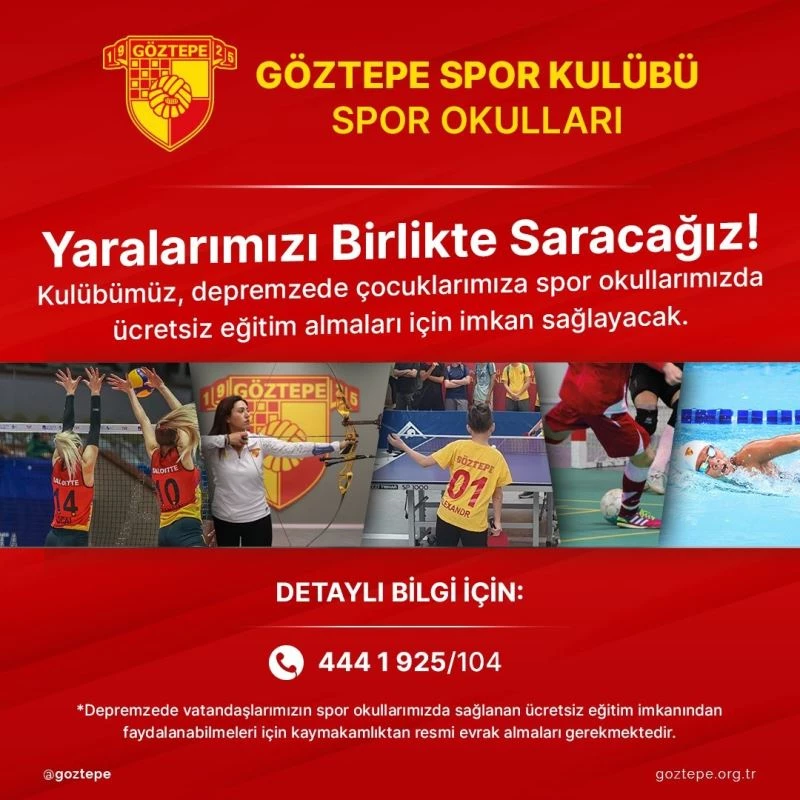 Göztepe, merkez üssü Kahramanmaraş olan ve 11 ilde büyük hasarlara sebebiyet veren depremlerden etkilenen çocuklara sarı-kırmızılı spor okullarında ücretsiz eğitim verileceğini duyurdu.
