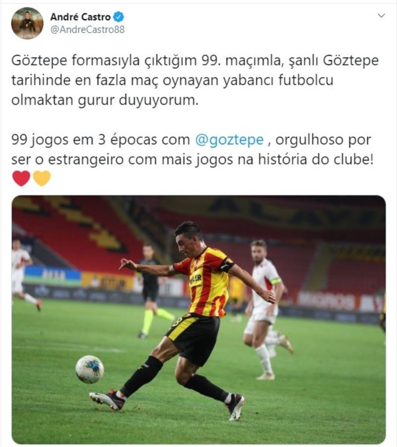 Göztepe’nin 2017 yılında Kasımpaşa’dan kadrosuna kattığı Portekizli Andre Castro, geçtiğimiz hafta oynanan Gençlerbirliği maçıyla beraber 99 kez sarı-kırmızılı formayı giyerek, kulüp tarihine geçti. Göztepe formasıyla en fazla maça çıkan yabancı oyuncu olma unvanını elde eden 32 yaşındaki orta saha oyuncusu, sosyal medya üzerinden açıklama yaparak, bu unvana sahip olmaktan dolayı gurur duyduğunu söyledi.