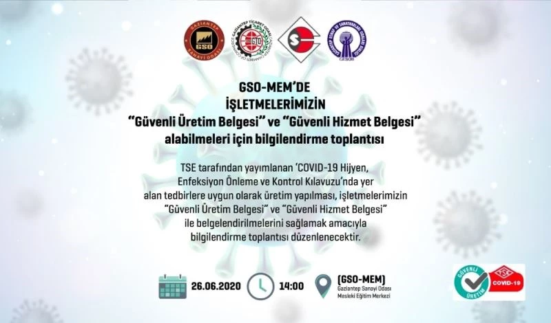 İşletmelerin kılavuzda belirtilen hijyen tedbirlerine uyarak üretim yapması ve bunu TSE nezdinde “Güvenli Üretim Belgesi” ve/veya “Güvenli Hizmet Belgesi” ile belgelendirmesine yönelik 26.06.2020, Cuma günü Saat: 14:00’te Gaziantep Sanayi Odası Mesleki Eğitim Merkezi’nde (GSO-MEM) “Covid-19 Hijyen, Enfeksiyon Önleme ve Kontrol Kılavuzu” genel bilgilendirmesi ve sonrasında “Güvenli Üretim Belgesi” ve/veya “Güvenli Hizmet Belgesi” süreci hakkında bilgilendirme toplantısı gerçekleştirilecek.
