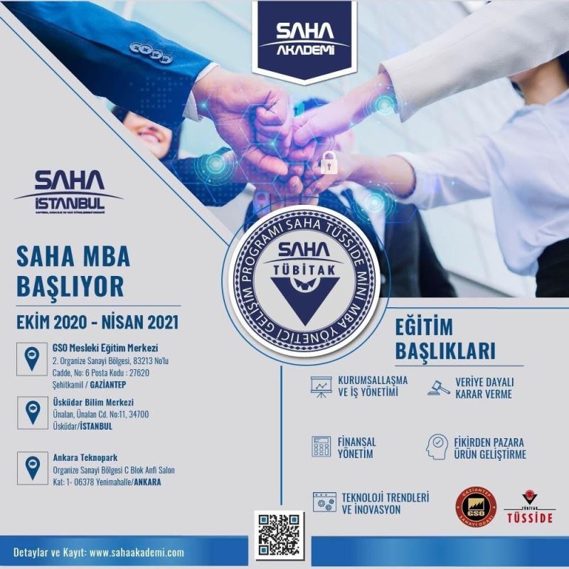 Gaziantep Sanayi Odası (GSO) ile SAHA İstanbul işbirliğinde Gaziantep’teki genç işadamları ve yöneticilere yönelik, Harward, Stanford gibi dünyanın en üst düzey 15 üniversitesinin MBA programlarından derlenen SAHA MBA programı düzenlenecek.