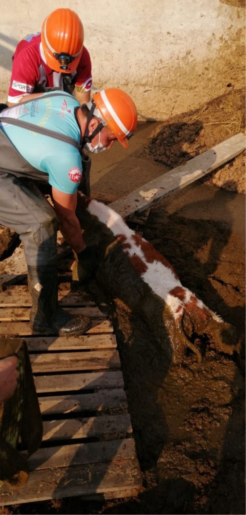 Olay yerine gelen itfaiye ekipleri, hayvanları saplandıkları gübre yığınından vinçli araç yardımıyla kurtararak Çelikbaş’a teslim etti.