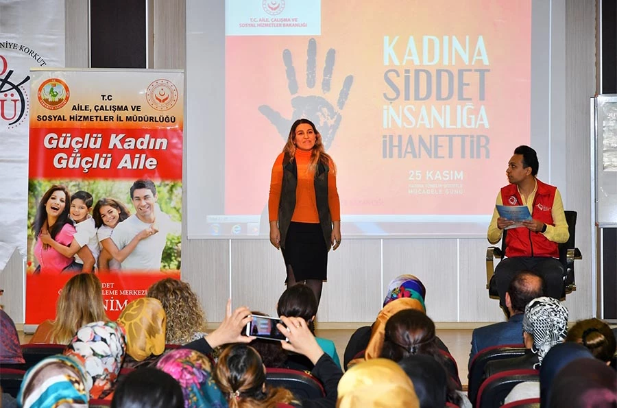 Osmaniye Aile, Çalışma ve Sosyal Hizmetler İl Müdürlüğü Şiddet Önleme Merkezi (ŞÖNİM) tarafından, "Kadına Yönelik Şiddete Karşı Uluslararası Mücadele Günü" dolayısıyla "Güçlü Kadın Güçlü Aile" başlıklı program düzenledi. Korkut Ata Üniversitesi Rektörlük Büyük Salonda gerçekleşen etkinliğe, OKÜ Rektörü Prof. Dr. Murat Türk, eşi Prof. Dr. Zeynep Türk, Osmaniye Valisi Ömer Faruk Coşkun`ın eşi Sevilay Coşkun, Aile, Çalışma ve Sosyal Hizmetler İl Müdürü Hamit Coşkun, Rektör Yardımcısı Prof. Dr. Alpaslan Dayangaç, akademisyenler, idari personel ile çok sayıda kadın izleyici katıldı. Açılış konuşmasını yapan Aile, Çalışma ve Sosyal Hizmetler İl Müdürü Hamit Coşkun, hayatın her alanında kadının statüsünü yükseltecek imkânlar verilerek ve fırsatların önü açılarak kadınların güçlendirilmesinde, kadın sorunlarının çözümüne yönelik politikalar üretilmesinde, kadınların çok yönlü mağduriyetini ve sorunlarını aşmada, adaleti dikkate alan adımlar ve yaklaşımlar büyük önem taşımakta olduğunu kaydetti. Hamit Coşkun, "Kadına yönelik şiddet; nerede yaşanırsa yaşansın evde, sokakta, iş yerinde ve benzeri yerlerde kadınlara kadın oldukları için uygulanan ve cinsel, psikolojik ve ekonomik zarar veren eylemler veya bu eylemlerle tehdit etme, zorlama veya özgürlükten yoksun bırakma anlamına gelir. Kadınların toplumsal, siyasal ve ekonomik hayatta ikinci planda kalmasına yol açan faktörlerin temelinde zihinsel kalıplar, yargılar ve bunlardan kaynaklanan tutum ve davranışlar yer almaktadır. Bu sebeple 25 Kasım Kadına Yönelik Şiddete Karşı Mücadele ve Uluslararası Dayanışma Gününde Aile, Çalışma ve Sosyal Hizmetler İl Müdürlüğü olarak Toplumsal Cinsiyet Eşitsizliğine, Ayrımcılığa, Kadına Yönelik Şiddete ve Aile İçi Şiddete sıfır tolerans ilkesi ile yolumuza devam ediyoruz." dedi. Daha sonra Aile, Çalışma ve Sosyal Hizmetler İl Müdürlüğü?nde sosyal çalışmacı Merve Altınışık, Rehber öğretmeni Baran Karabulut ve Osmaniye Meslek Yüksekokulu Çocuk Bakım ve Gençlik Hizmetleri programı Bölüm Başkanı Öğretim Görevlisi Mehmet İşıker kadına yönelik şiddeti konu alan sunumlar yaparken Sosyolog Özlem Direk ve Psikolog Emre Alpaslan Kadına Yönelik Şiddet konusunda iki örnek sundu.