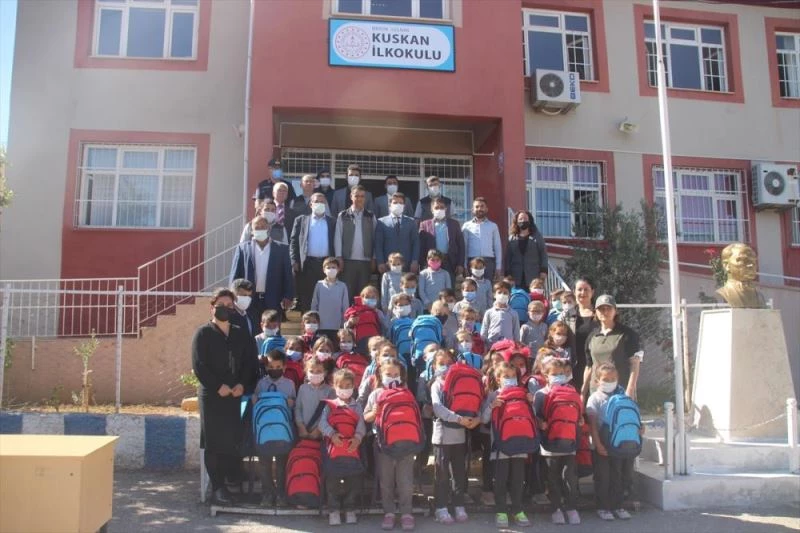 Kuskan İlköğretim Okulu'ndaki dağıtım töreninde, 1. ve 2. sınıf öğrencilerine okul çantaları hediye edildi.