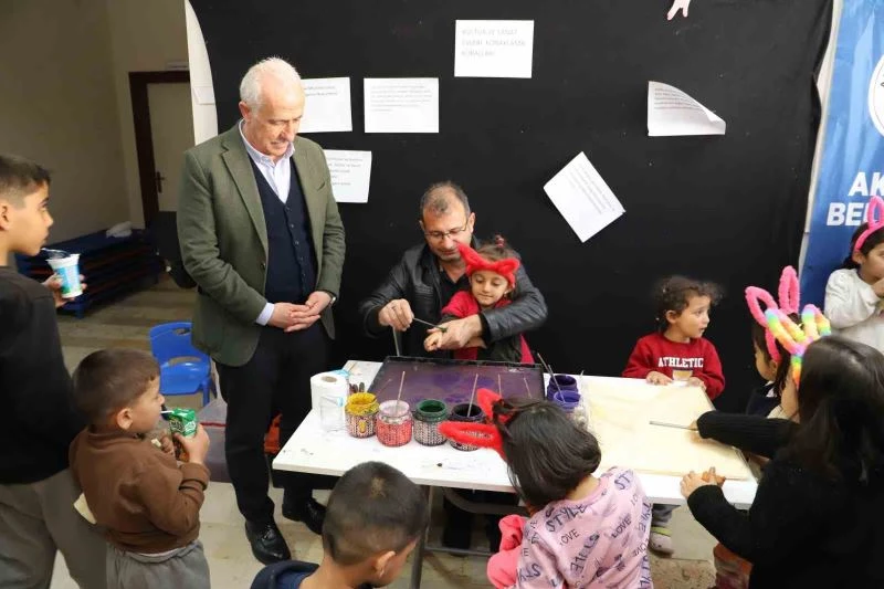 Aileleriyle birlikte ağırlanan depremzede çocuklara ebru sanatını öğreten Karacaoğlan Halk Eğitim Merkezi Görsel Sanatlar Öğretmeni Fehmi Açık, “Afetten sonra ben de teknemi, fırça ve boyalarımı alıp gelen misafirlerimiz ve çocuklarımızla bir araya geldim. Nerede olurlarsa yanlarına gidip böyle küçük etkinliklerle dikkatlerini sanata çekmeye çalışıyorum. Bugün de burada çocuklarımızla birlikte battal ebru çalışması yaptık” diye konuştu.